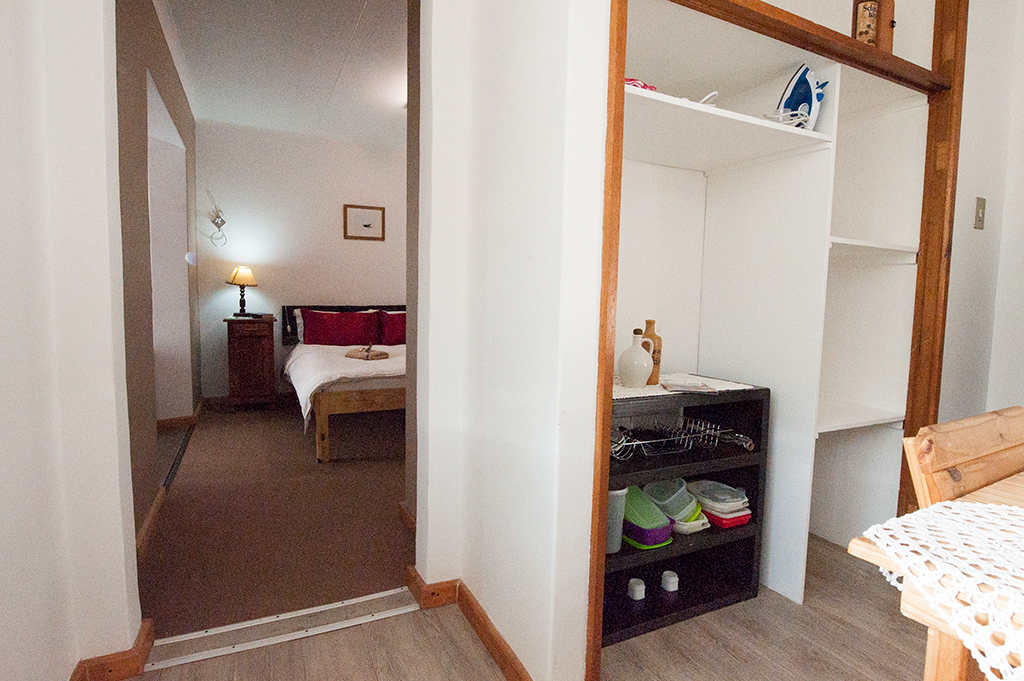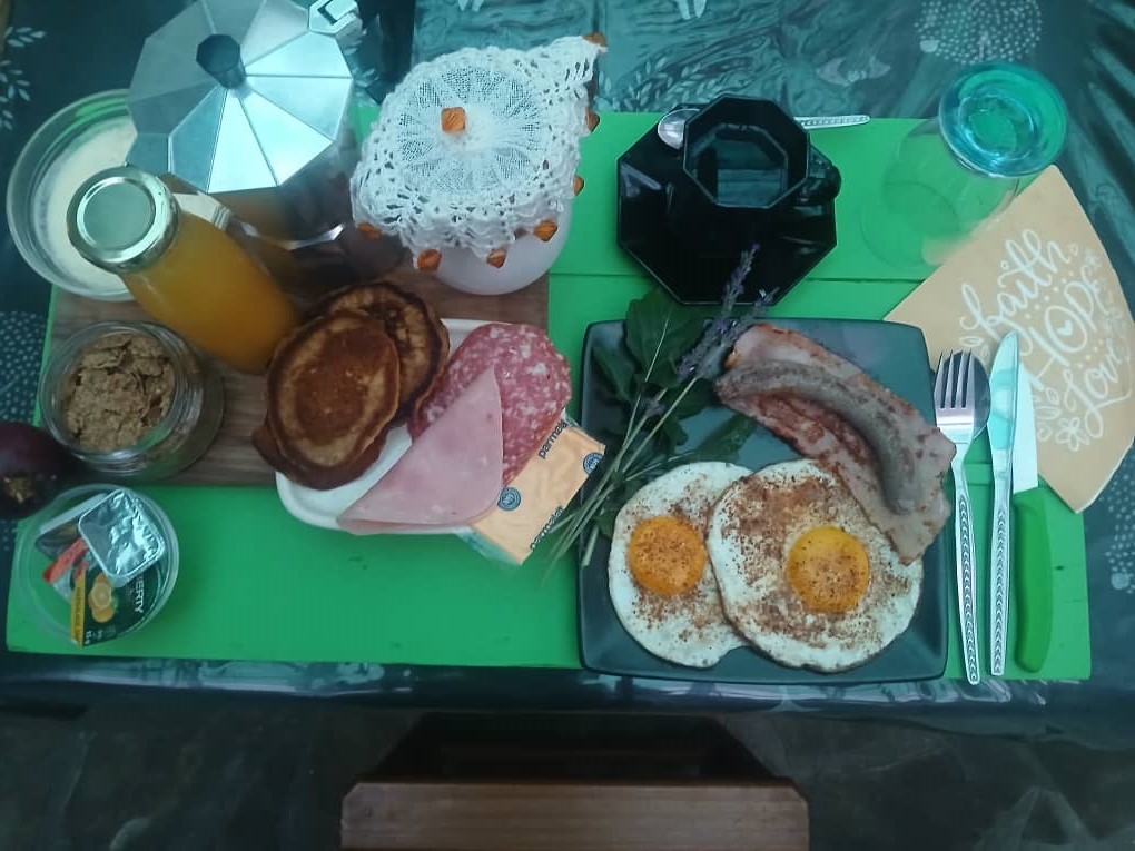 - Kitchen: Fridge, oven, 3-plate stove, microwave, kettle, and percolator